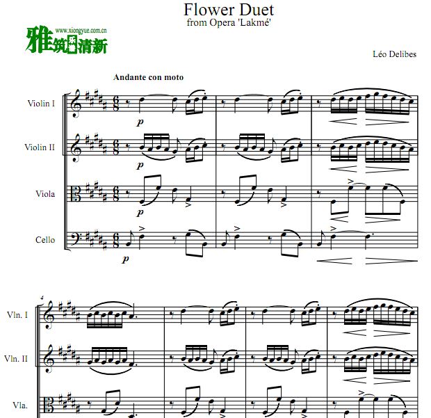 琴譜 Sheet Music 流行音乐乐谱 楽譜 五线谱 Lakme 拉克美 花之二重唱 双小提中提大提 弦乐四奏谱 PDF格式 高清晰版 可打印