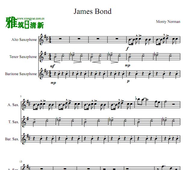 雅筑清新乐谱 电影007 James Bond主题曲萨克斯三重奏谱