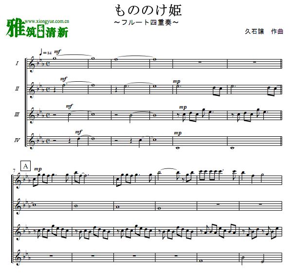 雅筑清新乐谱 幽灵公主 もののけ姫 长笛四重奏总谱+分谱