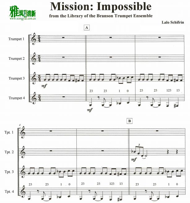 琴譜 Sheet Music 流行音乐乐谱 楽譜 五线谱 碟中谍Mission Impossible小号四重奏谱 PDF格式 共4页 清晰版 可打印