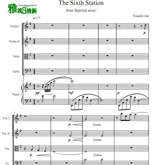 琴譜 Sheet Music 流行音乐乐谱 楽譜 五线谱 千与千寻 The Sixth Station双小提琴中提琴大提琴钢琴五重奏谱 PDF格式 高清晰版 可打印