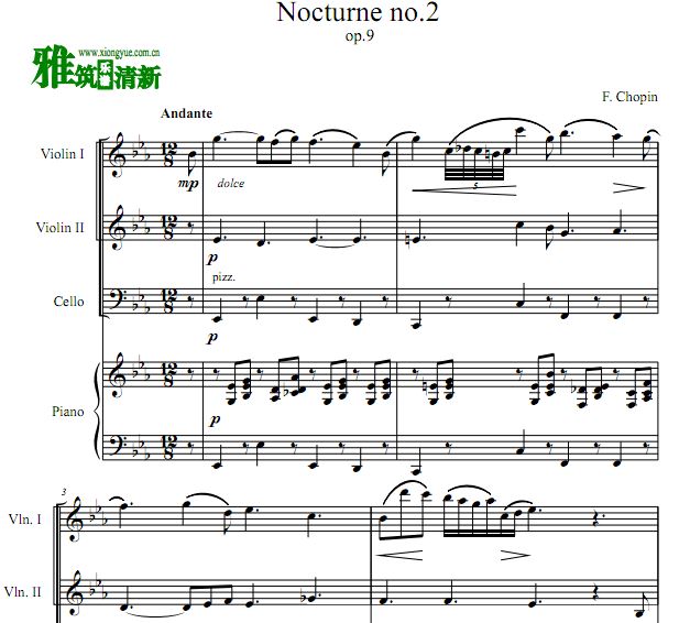 肖邦 降E大调夜曲双小提琴大提琴钢琴四重奏谱 Nocturne Op.9 No.2
