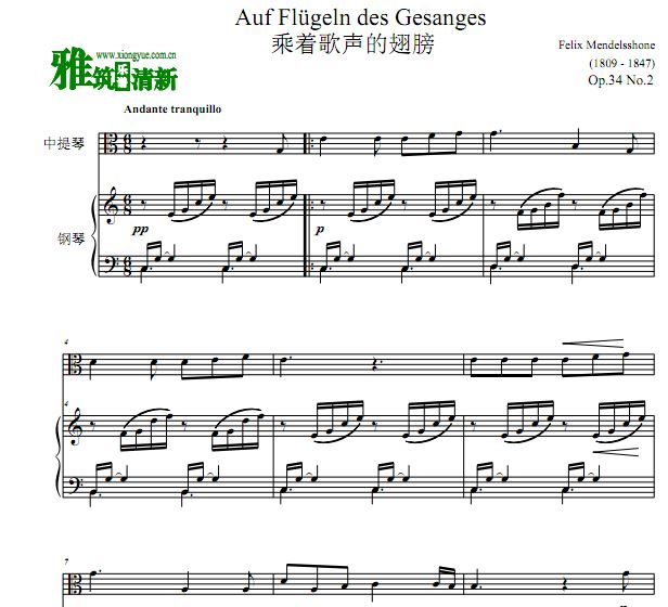琴譜 Sheet Music 流行音乐乐谱 楽譜 五线谱 门德尔松 乘着歌声的翅膀中提琴钢琴二重奏谱 (C调) PDF格式 高清晰版 可打印