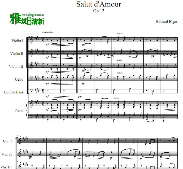 琴譜 Sheet Music 流行音乐乐谱 楽譜 五线谱 Salut d'amour 爱的致意三小提大提低音提琴钢琴六重奏谱 PDF格式 高清晰版 可打印