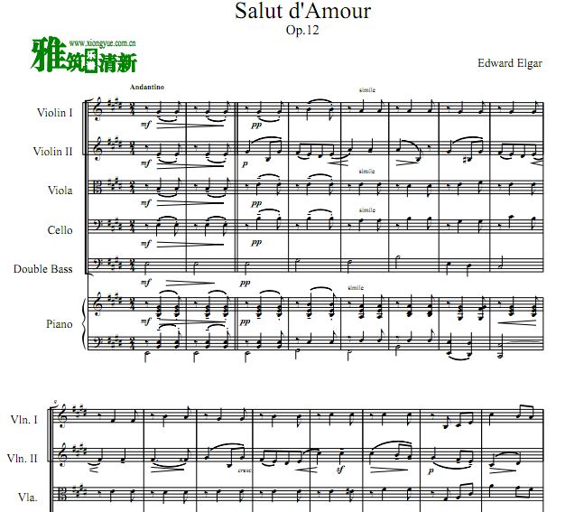 琴譜 Sheet Music 流行音乐乐谱 楽譜 五线谱 Salut d'amour 爱的致意双小提大提低音提琴钢琴六重奏谱 PDF格式 高清晰版 可打印
