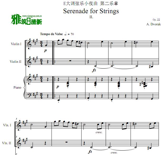 琴譜 Sheet Music 流行音乐乐谱 楽譜 五线谱 德沃夏克 E大调弦乐小夜曲 Op.22 第二乐章 二小提钢琴重奏谱 PDF格式 高清晰版 可打印