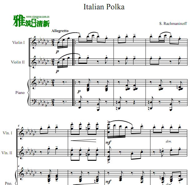 琴譜 Sheet Music 流行音乐乐谱 楽譜 五线谱 拉赫玛尼诺夫 Italian Polka 意大利波尔卡 二小提钢琴三重奏谱 PDF格式 共页 高清晰版 可打印